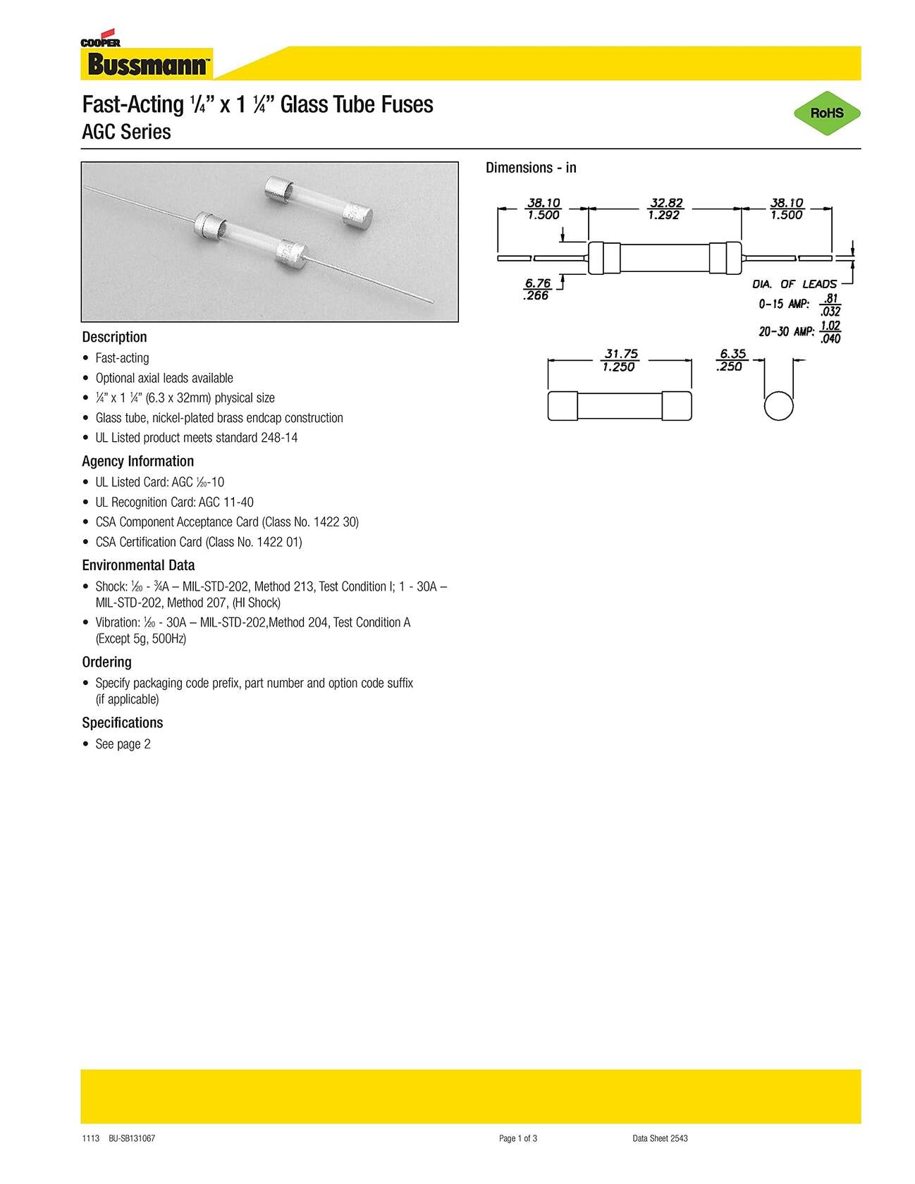 Fast-Acting fuse with glass tube and Nickel-plated Brass end caps. The arc fuse is an UL listed product, which meets the standard 248-14. Wide amp/Volt ratings allow versatility of protecting electronic circuits. Pack of 5.