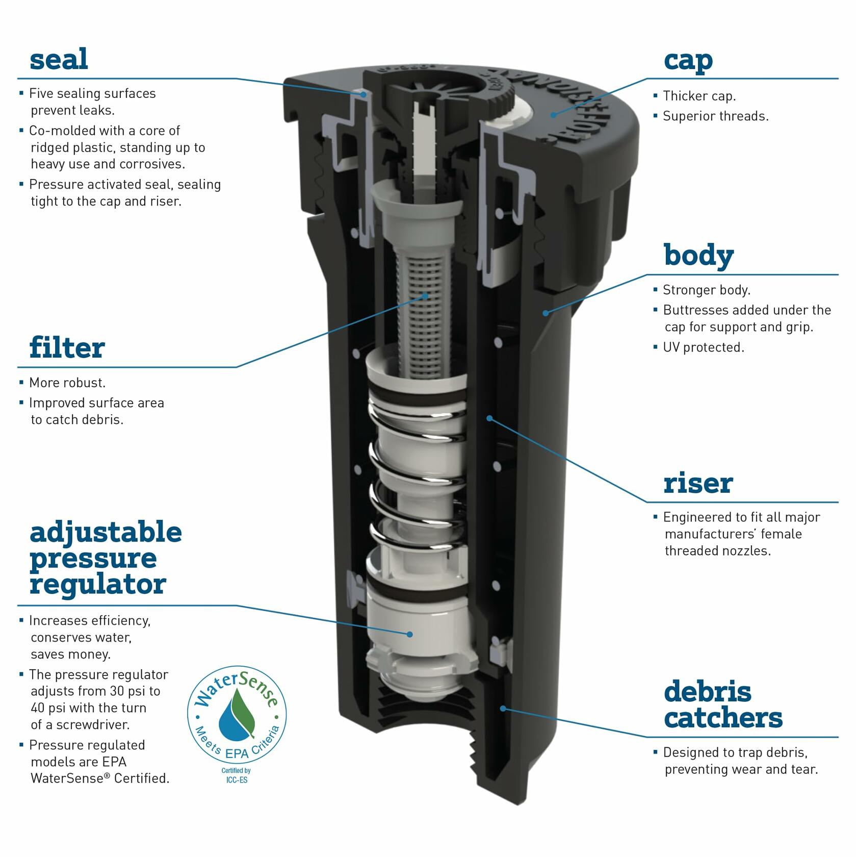The professional series spray head is the premium offering in the Orbit irrigation sprinkler lineup. This pop-up spray head features a highly innovative pressure regulator which you can adjust from the bottom of the can before installation, or from the top of the can after installation, from 30 to 40 PSI. 30 PSI is recommended for spray nozzles while 40 PSI is recommended for multi-stream rotator nozzles. It is available in 2-, 3-, 4-, 6- and 12-in. riser heights and is ideal for a broad range of landscape types. The wiper seal features an over-molded structural support that ensures long-term, smooth retraction and prevents water from blowing by the riser stem. The riser spring which creates the pop-up action is made of corrosion-resistant stainless steel for years of reliable operation. A ratchet mechanism in the riser stem allows you to adjust the direction of the spray after installation. The bottom of the can has an integral silt trap. The spray body inlet has standard 1/2-in. female pipe threads (FPT) which connect to Blu-Lock and Riser-Flex fittings, as well as 1/2-in. Schedule 80 PVC and cut-off risers. The flush cap allows you to blow debris out of the line before installing the nozzle (sold separately). The riser stem is compatible with all female-thread nozzles from Orbit, Hydro-Rain, and other major brands. For outdoor irrigation use with cold water only.